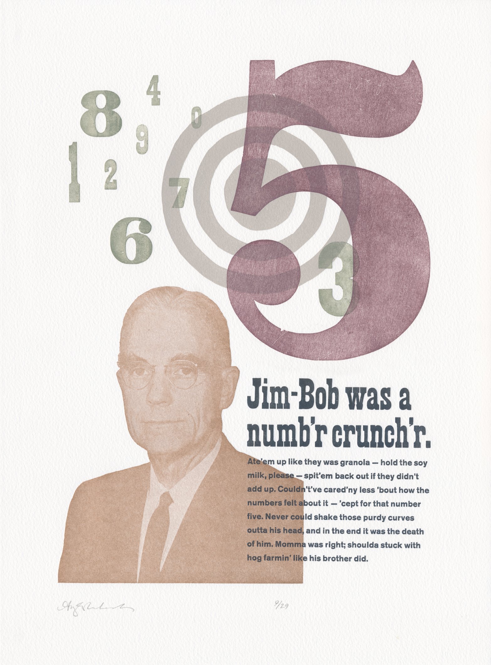 This print all started with the lovely figure 5, & the story grew from there. Stubbornly composed on too short of a line length with handset metal & wood type, swirling alongside a vintage halftone image of an unidentified gentleman you can call Jim-Bob. Experimental inking techniques were applied on the green figures using an old toothbrush. (Jim-Bob kept his mouth shut that whole time.)