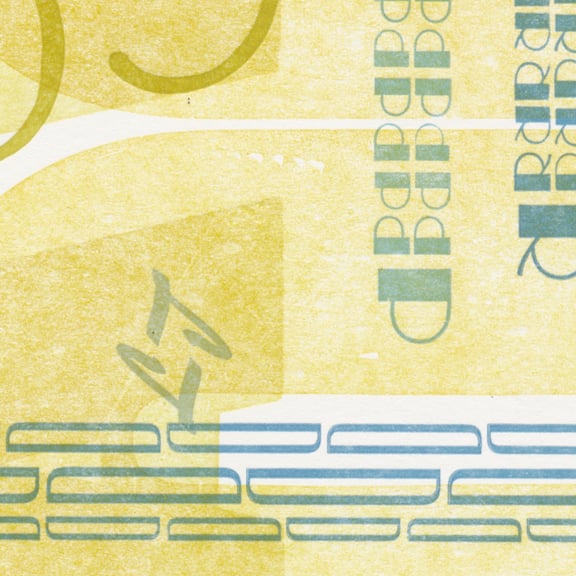 This abstract image is composed of metal and wood types, set by hand one character at a time. Each printed layer is designed in the moment, a reaction to the one before it, all while the ink is still wet on press.