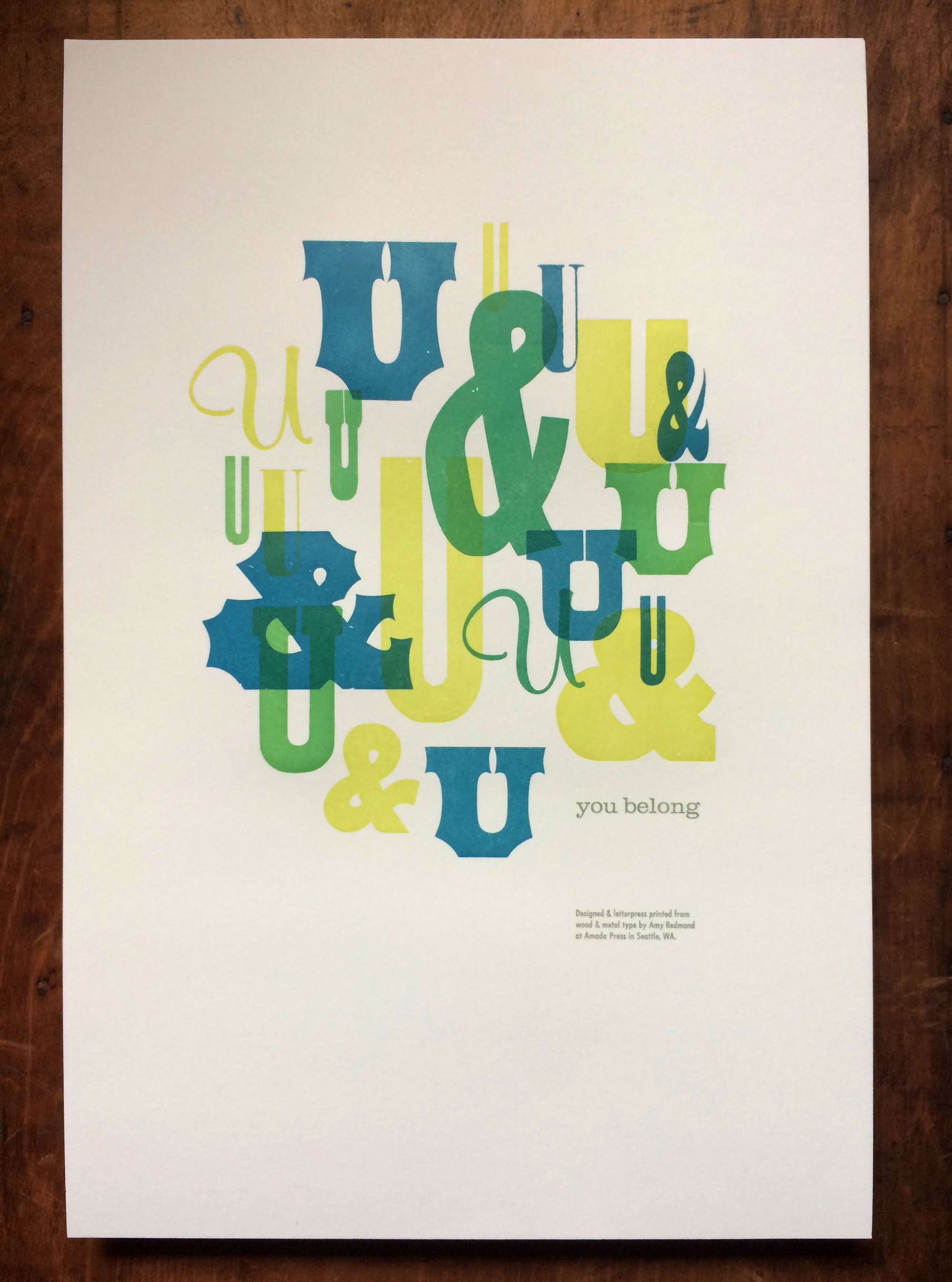 Limited edition typographic poster with the message, "you belong." Letterpress printed in green and blue inks using handset wood and metal type on a Vandercook 4 cylinder press.